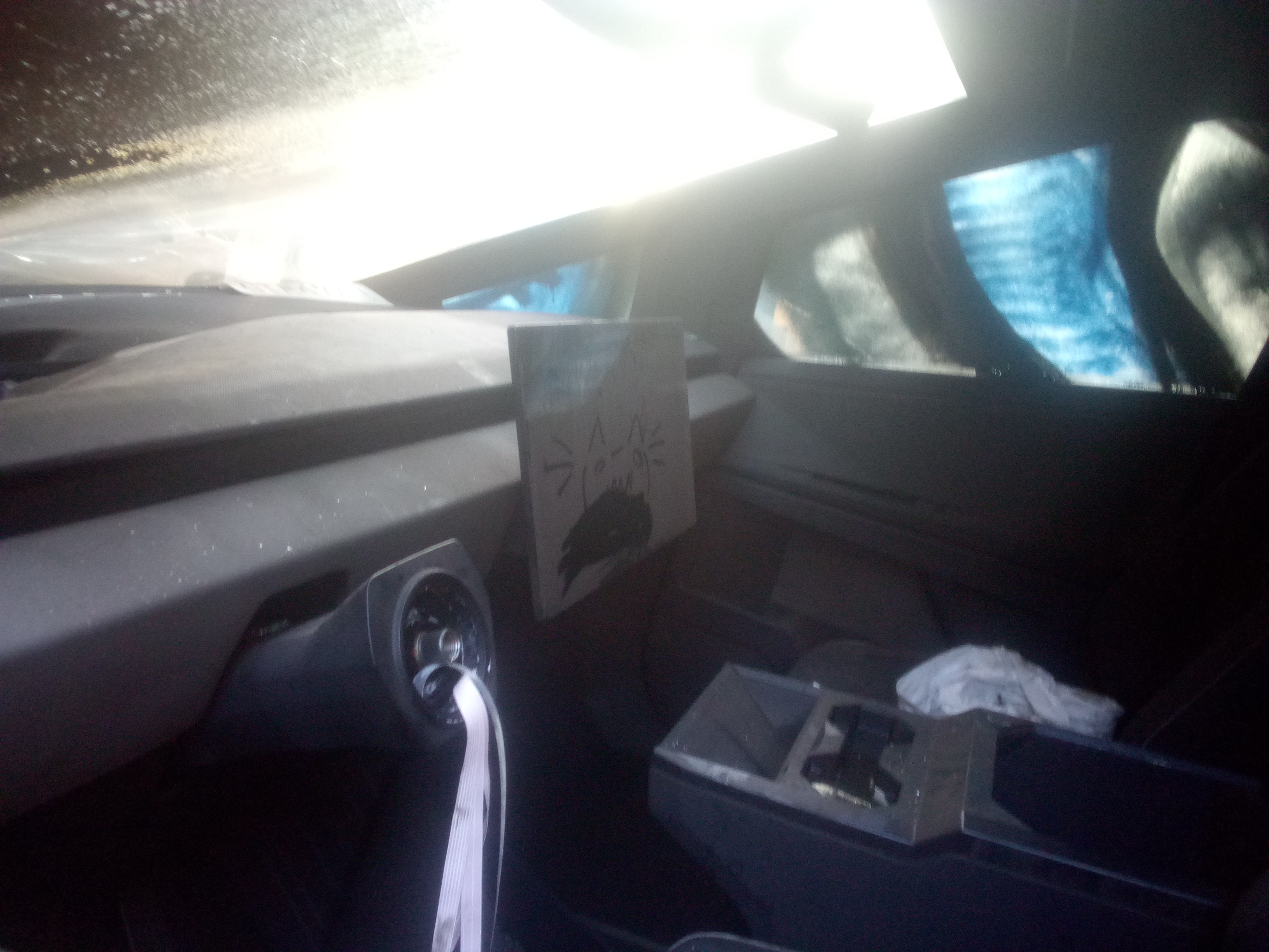 | A copy of [[Douglas Adams]]’ novel ‘’[[The Hitchhiker’s Guide to the Galaxy (novel) | The Hitchhiker’s Guide to the Galaxy]]’’ is in the glove box, along with references to the book in the form of a [[Phrases from The Hitchhiker’s Guide to the Galaxy#Knowing where one’s towel is | towel]] and a sign on the dashboard that reads “[[Phrases from The Hitchhiker’s Guide to the Galaxy#Don’t Panic | DON’T PANIC!]]”.{{blist | {{cite tweet | user=tiamaria68uk | number=938930620511801345 | access-date=December 8, 2017 | date=December 8, 2017 | title= Will the glove box contain “The Hitchhikers Guide To The Galaxy”?}} | {{cite tweet | author-link=Elon Musk | user=elonmusk | number=938947119246860290 | access-date=December 8, 2017 | date=December 8, 2017 | title=Yes}} | {{cite tweet | author-link=Elon Musk | user=elonmusk | title=Plus a towel and a sign saying ‘Don’t Panic’ | number=939005893634506752 | access-date=December 8, 2017 | date=December 8, 2017}} }}</ref> |