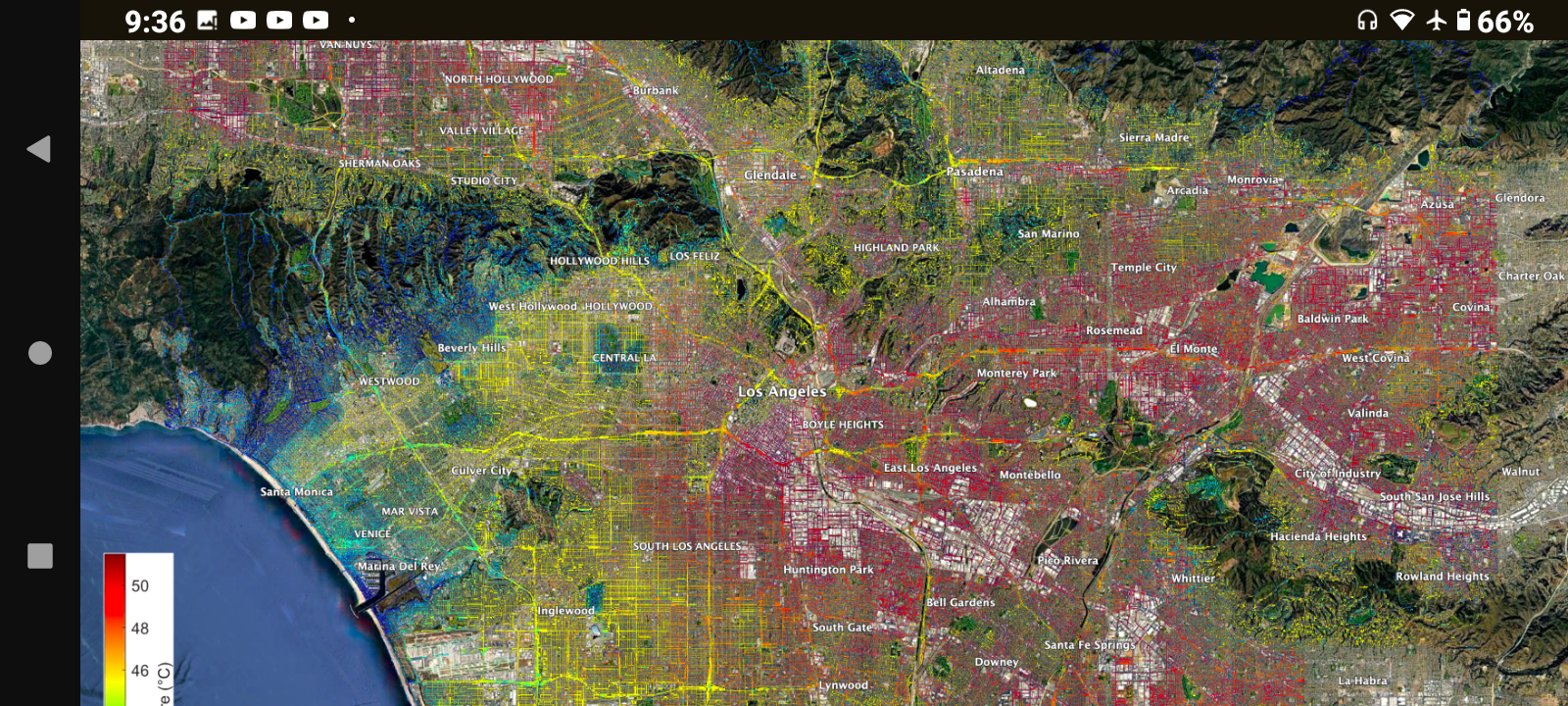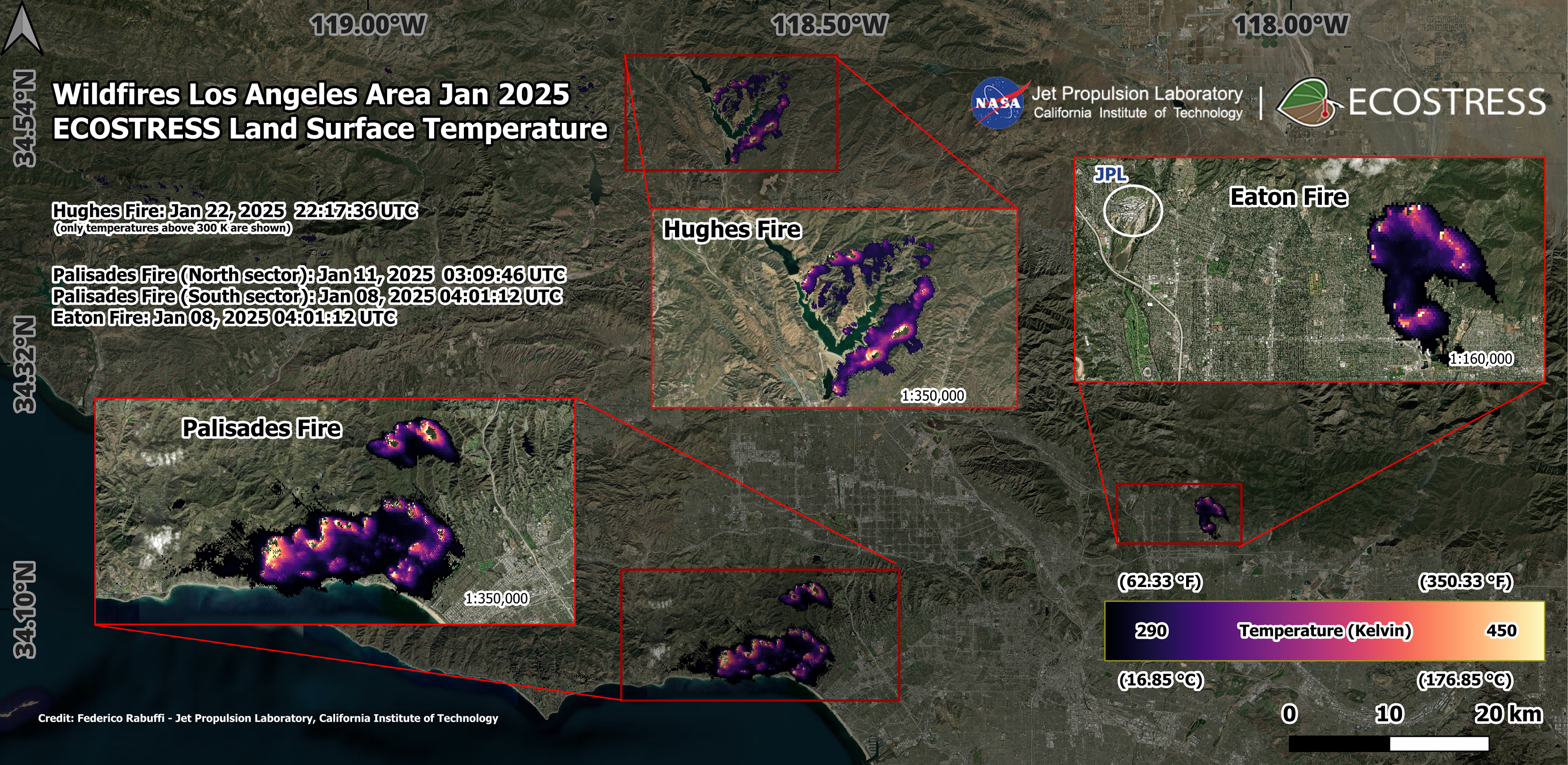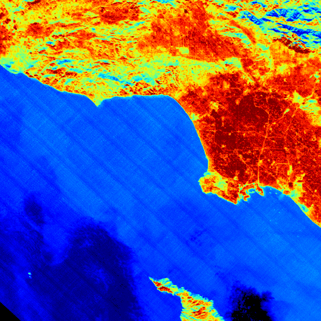 NASA’s ECOSTRESS Maps LA’s Street Temperatures. Click on image to see larger version. - NASA/JPL-Caltech In this overlay image, retrieved land surface temperature (LST) from NASA’s Ecosystem Spaceborne Thermal Radiometer Experiment on Space Station (ECOSTRESS) was downscaled to a spatial resolution of 10m and overlaid on a street map of Los Angeles. The image was derived by taking an average of all clear-sky afternoon (1-4pm) imagery acquired by ECOSTRESS from 2018-2023. The LST represents the ‘skin’ temperature of the surface (that you would feel to the touch) and is usually much hotter than the surface air temperature that meteorologists report in a weather forecast.